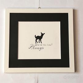 Quadretto con cornice in legno bianco e passepartout nero a tema Harry Potter con disegno di cerbiatto e frase "After all this time? Always".