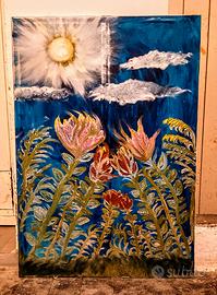 Quadro dipinto acrilico paesaggio stilizzato, dimensioni: orizzontale 69,5cm, altezza 99,5cm.
