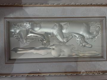 Elegante quadro in argento 925 finemente lavorato, raffigurante una scena stilizzata a basso rilievo, probabilmente ispirata a motivi naturalistici o mitologici (cavalli alati, foglie, forme astratte).
