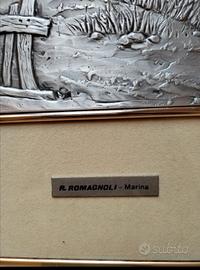Quadro altorilievo su lastra argento 925/*** - anni 90. Scultore Maestro Renzo Romagnoli. Titolo "Marina" - Dimensioni cornice in legno cm 40x36. Dimensioni bassorilievo cm 18x13. argento 925/*** e particolari in oro. Spessore cornice in legno massiccio lucido cm 3,5. con garanzia Zeta Studio D'arte.