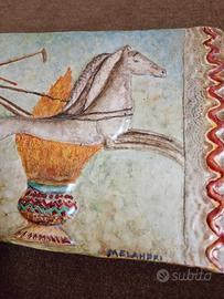 piastra in ceramica policroma a smalto mat, opaco, del maestro faentino Pietro Melandri (1885 - 1976), con bassorilievo di "Biga Egiziana".