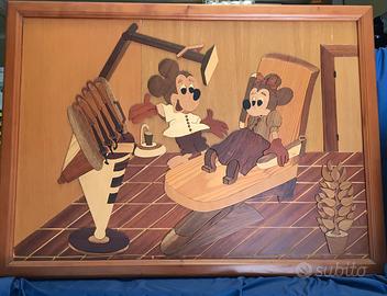 Quadro unico nel suo genere in legno patchwork, Topolino e Minnie dal dentista. Misure cm 80x 110