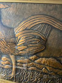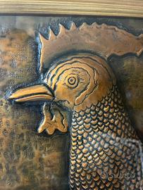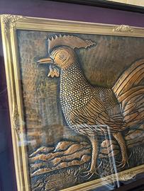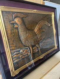 quadro artistico d'epoca realizzato con la tecnica del bassorilievo a sbalzo su lastra di rame. L'opera raffigura con estrema maestria e dettaglio un esemplare di Gallus Sonneratii (conosciuto come Gallo Grigio della Giungla), come indicato dall'incisione nell'angolo in basso a sinistra. Il lavoro artigianale è di alta qualità, con una resa minuziosa del piumaggio e dei dettagli anatomici dell'animale, poggiato su un fondo paesaggistico anch'esso lavorato a rilievo.