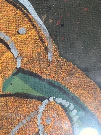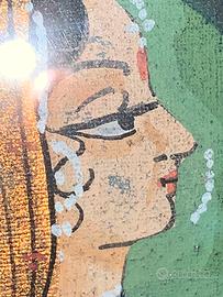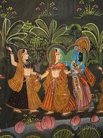Quadro Indiano Seta Anni '60 Krishna - 93x57 cm ** Oggetto in ottimo stato // possibilitá di spedizione Tuttosubito // Preferibile consegna a mano mio domicilio di Roma** Raffinata opera d'arte tradizionale indiana risalente agli anni '60, di grandi dimensioni (93 x 57 cm). Si tratta di un pregiato dipinto realizzato a mano con tecnica a tempera su seta naturale. L'opera raffigura la Rasalila, la danza spirituale del Signore Krishna (divinità dalla pelle blu) insieme alle Gopi, ambientata nei boschi mitologici di Vrindavana. Lo stile richiama la celebre scuola del Rajasthan, con dettagli finissimi nei volti, nelle vesti e nei gioielli. Caratteristiche principali: Supporto: Seta naturale d'epoca (la trama originale è visibile nei dettagli). Dimensioni: 93 x 57 cm (formato importante, ideale per una parete principale). Cornice: Completo di cornice vintage originale dell'epoca in legno sottile rosso e oro, con ampio passe-partout. Stato: Eccellenti condizioni di conservazione, colori vividi e saturi. Un pezzo di modernariato etnico di grande impatto, perfetto per collezionisti di arte orientale o per arredare ambienti eleganti e ricercati.