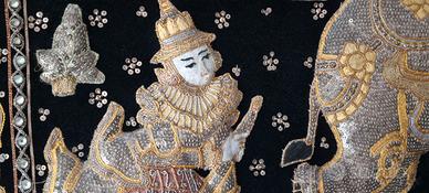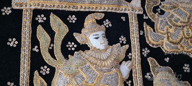 Vendo quadro indonesiano Kalaga in tessuto con filo dorati e pietre. Elefanti e personaggi imbottiti. In ottimo stato dimensioni 107x83. Lo vendo con la cornice.