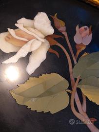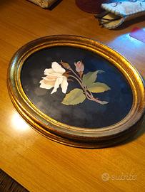 Vendo elegantissimo quadro intarsiato a marmo, cornice dorata. Probabilmente dell'800. Cornicevrivestita in foglia d'oro. Dimensioni cm 21x29.