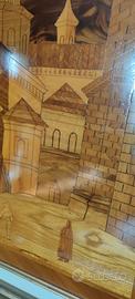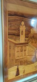 Opera di intarsio ligneo che rappresenta uno scorcio architettonico classico, Rappresenta una veduta di Piazza del Duomo a Firenze, interpretata secondo il gusto della prospettiva rinascimentale. Si riconoscono chiaramente i simboli della città: Il Battistero di San Giovanni: L'edificio al centro, con la sua caratteristica pianta ottagonale; Il Campanile di Giotto: La torre alta e slanciata sulla destra; la Cattedrale (Santa Maria del Fiore): Si intravede sulla destra, dietro il campanile; La Loggia e i Palazzi: Gli edifici sulla sinistra