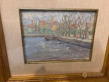 Piccolo quadro olio su tela Inverno a Desenzano firmato con cornice e vetro anno 1968