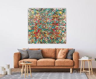 Grande dipinto astratto di forte impatto visivo, caratterizzato da colori puri e finitura lucida, ideale per ambienti moderni e spazi di rappresentanza.