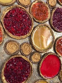 Materiali : pasta modellabile, vetri levigati colorati, resina epossidica, corde naturali in fibra di canapa.