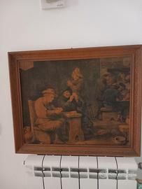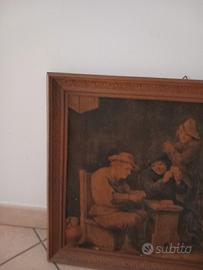 Quadro legno vintage rappresenta uomini lgioco scena ' 800/900..cornice intaglio x amanti quadri d'epoca ..base e sfondo legno litografia o stampa non conosco misure 48 x 58 circa ne ho un'altro simile la coppia 49