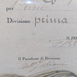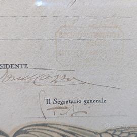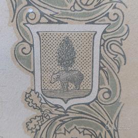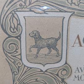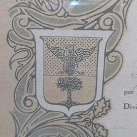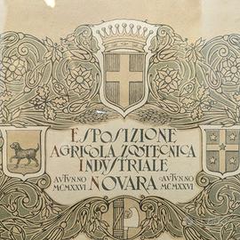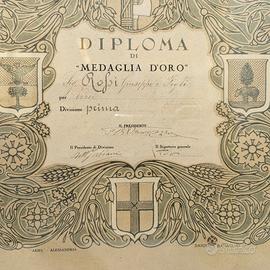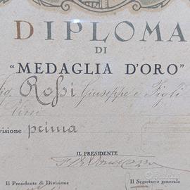 Raro Diploma di Medaglia d'Oro dall'Esposizione Agricola Zootecnica Industriale di Novara, Autunno 1926 (MCMXXVI). Assegnato a Rossi Giuseppe e Figli per Vini Divisione prima. Elegante pergamena con stemmi araldici (cane, scudo con croce e stelle, aquila con albero, orso con albero che probabilmente rappresentano le città della zona) firme autografe del Presidente di Divisione e Segretario Generale, timbro ufficiale. Incorniciato in cornice Liberty in legno intagliato dorato con rose, foglie e colonne.