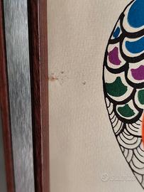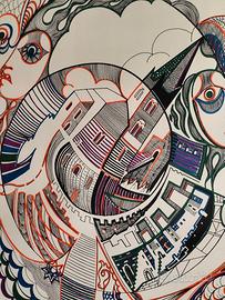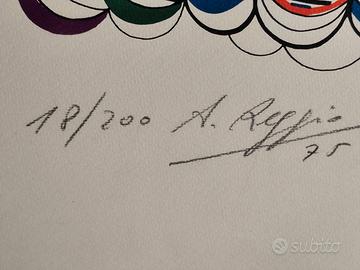 RARA Litografia Numerata 18/200 - A. Reggio '75 - Cornice Originale Fratelli Pomillo (Genova) – Grande formato (52,5 x 71 cm) Opera grafica d’epoca (1975) su cartoncino d'arte, firmata dall'artista A. Reggio. Surrealismo geometrico e architettonico onirico. Si tratta di una tiratura limitatissima e numerata (esemplare 18 di 200), un pezzo da collezione per amanti del surrealismo e del design anni '70. • Dimensioni Cornice: 52,5 cm x 71 cm. • L'opera conserva la sua cornice originale dell'epoca in noce con profilo interno in alluminio spazzolato. È stata confezionata a Genova presso lo storico laboratorio "Fratelli Pomillo"; • Fronte: Il cartoncino presenta la naturale patina del tempo con alcune fioriture fioriture (foxing) e un paio di piccoli strappi superficiali sul bordo. • Retro: L'opera è conservata nel suo stato originale del 1975. Il pannello posteriore è quello originale ma usurato/danneggiato dal tempo e, per una conservazione perfetta nei prossimi 50 anni, beneficerebbe di un semplice rinforzo del pannello, dettaglio di cui si è tenuto conto nel prezzo. • Vetro: Integro Ritiro: Esclusivamente a mano a Piacenza (dato il vetro, le dimensioni e la fragilità del retro)