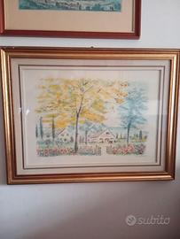 Quadro litografia su carta intitolata "Palo Alto" artista Michele Cascella. Soggetto: Paesaggio con case, alberi e fiori, tipico dello stile dell'artista, dimensioni quadro lunghezza cm 85 x altezza cm 68, ritiro milano zona san siro - no spedizione