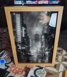 Quadro luminoso a LED con un design a "pittura di luce" che raffigura un paesaggio urbano futuristico in stile cyberpunk.