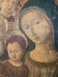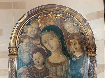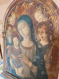 antico quadro sacro su tavola lignea raffigurante la Madonna con Bambino e santi.