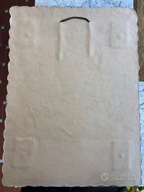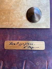 Quadro della Mdonna con bambino realizzata con intarsi di differenti metalli. L'immagine risulta firmata M. Pagano ed è fissata su un pannello di duro cuoio. Misura cm 30 di base per 40 di altezza.