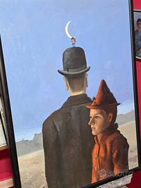 quest'opera di Rene' Magritte è stata contaminata con un pinocchio perché l'originale si intitola "Il maestro di scuola" e quindi ironicamente, mentre il maestro guarda al di là, l'orizzonte....Pinocchio è girato in un'altra direzione perché non gli interessa studiare e quindi la cultura per lui non serve a niente. Si tratta di un olio su tela 80x60cm fatta da me compresa di cornice nera come in foto.