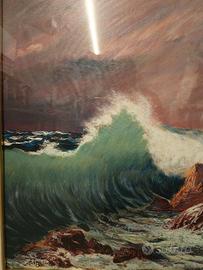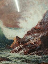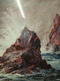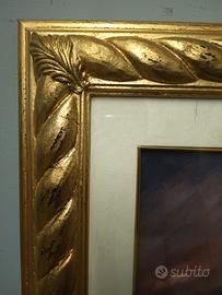 Quadro raffigurante scoglio con mare dai colori intensi, in cornice di legno dorata e intagliata. Serigrafia autenticata del famoso Giovanni Francesco Gonzaga, '900, mis h 75, l95, p5, solo tela 51x70