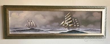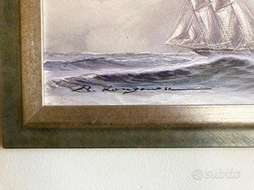 In vendita quadro raffigurante scena marina con velieri in navigazione, dipinto a olio su tela, attribuito a Renato Longanesi (Bologna, 1931 – 1990), pittore italiano noto per le sue marine e soggetti nautici.