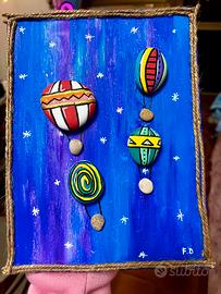 Vendo splendido quadro artigianale realizzato a mano, un'opera unica che unisce pittura e pebble art (arte con i sassi). Quattro vivaci mongolfiere decorate nei minimi dettagli prendono vita su uno sfondo sfumato che richiama un cielo stellato magico tra il blu e il viola. 24x18cm