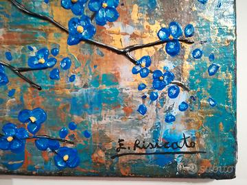 Un fondo spatolato con colori vibranti e accesi, di diverse tonalità dal blu al verde acqua al dorato su cui si staglia un ramo fiorito, materico e corposo che sembra quasi voler uscire dalla tela. piccoli fiori blu, anch'essi corposi e spessi sbocciano e rallegrano il dipinto.