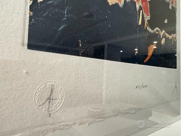 Attraverso un processo di fotoincisione è stata realizzata una matrice in ottone dello spessore di 1 mm, con la quale è stata impressa tramite torchio calcografico a mano la firma in rilievo del Maestro e tutti i rilievi dei décollages.