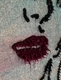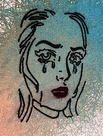 L’opera presenta un fondo in acrilico astratto ricco di movimento e intrecci materici. Al centro emerge un volto femminile dal forte impatto visivo, arricchito da gocce di silicone che donano texture e profondità.