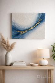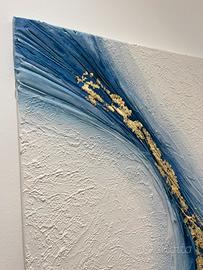 Questo quadro unico è realizzato con una tecnica di pasta materica, che conferisce una texture 3D incredibile, creando un effetto visivo e tattile straordinario. I colori acrilici utilizzati, insieme alla delicata applicazione della foglia oro, aggiungono un tocco di lusso e raffinatezza. La combinazione di blu intensi e accenti dorati rende quest’opera d’arte perfetta per ogni ambiente che desideri valorizzare.