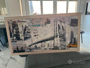 Vendo quadro d'arredo stile Pop Art con l'iconica immagine di Audrey Hepburn. Il design elegante in bianco e nero è arricchito da dettagli colorati e scritte tipografiche vintage. • Dimensioni: 107 cm x 57 cm. • Cornice: Nera minimalista, pronta da appendere.