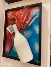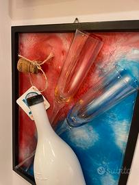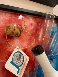 Quadro Moderno composto con una Bottiglia Astoria e 2 Flûte Anni ‘60 in vetro e relativo tappo in sughero.