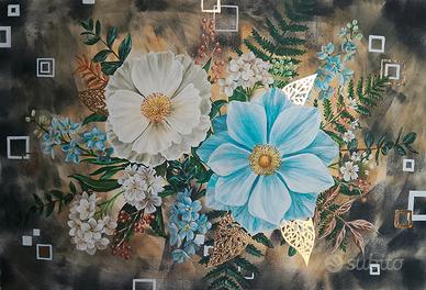 L’opera è dipinta a mano e raffigura una composizione di fiori delicati nei toni del bianco e dell’azzurro, arricchita da dettagli in foglia d’oro. Realizzato con tecnica acrilica su cartone telato, il quadro unisce uno stile moderno e decorativo a un tocco artigianale. Lo sfondo materico e le forme geometriche leggere creano un contrasto armonioso con la naturalezza dei fiori. Caratteristiche: 🎨 Tecnica: acrilico e foglia d’oro 🖌️ Supporto: cartone telato 📏 Dimensioni della tela 70 x 50 cm 🖼️ Cornice inclusa (finitura oro anticato, simile a quella mostrata in foto) ✋ Dipinto a mano – ogni pezzo è unico Nota importante: L’immagine della cornice è a scopo illustrativo: la cornice fornita sarà in stile oro anticato, molto simile alla foto. Ideale per: Arredare soggiorni, camere da letto o ingressi Regali eleganti e originali Ambienti moderni, classici o shabby chic Lara S.