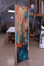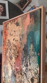 Quadro moderno materico, acrilico foglia oro e foglia rame, artista Renato Abbamonte, 40x150 cm. + cornice legno.