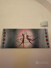 Vendo causa trasloco elegante quadro moderno 170x70 raffigurante due ballerine stilizzate in tonalità rosse e rosa, con sfondo sfumato grigio e decorazioni laterali.