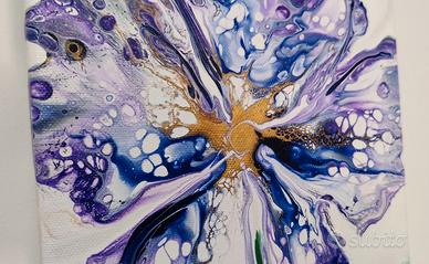 Quadro moderno astratto, dipinto a mano, unico ed originale con la recentissima tecnica della fluid art, dove le campiture di colore scorrono fluide e organiche. Un processo creativo in cui il colore è fluido e scorre, divenendo il mezzo per raggiungere dei risultati visivi che diversamente non sarebbero possibili. Prendono vita sulle due tele dei fiori astratti con sfumature di viola, blu e dorato che si mescolano sul fondo bianco.