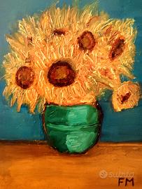 L’opera raffigura un mazzo di girasoli in vaso, opera dai colori caldi e vivaci, pennellate in stile materico, spesse e texture evidente.