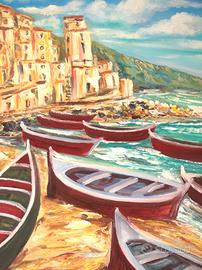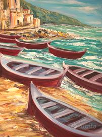 Quadro moderno materico " barche sulla riva " olio su tela dim 50x70 dipinto a mano firmato con autentica su retro dell'artista Nuovo Unico
