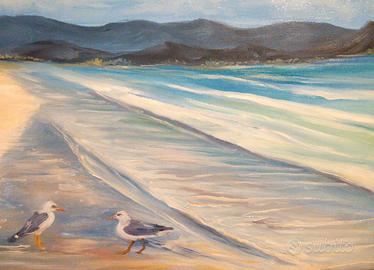Quadro moderno paesaggio " gabbiani " olio su tela dim 50x70 dipinto a mano firmato con autentica su retro dell'artista Nuovo Unico