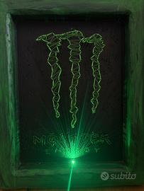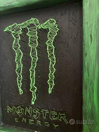 Quadro Monster Energy dimensioni 50x40 fatto totalmente a mano. In dotazione anche batteria di ricambio per led. Supporto per appendere al muro sul retro del quadro. Logo e scritta realizzati con chiodi in acciaio e filo da cucito intrecciato tutto a mano. Possibilità di creare oggetti su richiesta