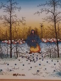 Quadro naif con paesaggio neve e colore predominante blu e giallo