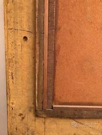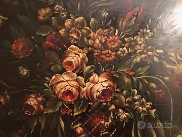 a descrizione si riferisce a un’opera d'arte raffigurante una **natura morta** realizzata con tecnica a **olio su tavola**, una scelta classica per i dipinti di epoca tardo settecentesca. La **cornice**, di dimensioni **128 x 101 cm**, presenta un’elegante finitura in **verde** con un raffinato **filo d’oro perimetrale**, che aggiunge un tocco di prestigio e ricchezza all'insieme.