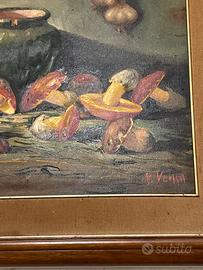 Vendo bellissimo dipinto a olio raffigurante una natura morta con funghi, vaso e dettagli rustici. Un’opera dal fascino caldo e tradizionale, perfetta per arredare cucina, sala da pranzo o ambienti dallo stile classico. Dettagli: •Tecnica: olio su tela •Soggetto: natura morta con funghi e vaso •Firmato in basso a destra (“P. Venia”) •Cornice in legno inclusa, elegante e in buone condizioni •Ottimo stato generale Colori caldi e atmosfera accogliente, ideale per chi ama l’arte tradizionale e le composizioni naturali.