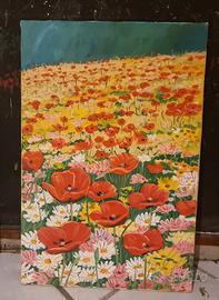Dipinto a olio su tela con campo di papaveri, colori vivaci e molto decorativo. Firmato P. Morosini. Perfetto per casa di campagna o ambiente luminoso. Misure 60 x 40