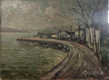 Affascinante dipinto a olio su cartoncino telato del pittore Enzo Volta, datato dicembre 1974. L'opera ritrae uno scorcio del Lago d'Idro (località Vantone) in pieno inverno. La pennellata è materica e decisa, con una palette di grigi, verdi e bruni che cattura perfettamente l'atmosfera plumbea e silenziosa del lago nei mesi freddi. In primo piano la curva della strada costiera, alberi spogli e alcune abitazioni tipiche sullo sfondo. Autore: Enzo Volta (firmato in basso a destra) Soggetto: Paesaggio lacustre (Lago d'Idro) Tecnica: Olio su cartone Data: 1974 (indicata sul retro) Condizioni: Buone condizioni generali, lievi segni del tempo sui bordi che non compromettono l'estetica (ideale da incorniciare). Dimensioni: misure in cm: 40 x 29,5 Perfetto per amanti del paesaggismo del '900 o per arredamenti in stile vintage, postmoderno e retro. #enzovolta #quadroantico #oliosucartone #paesaggiolago #lagodidro #pitturaitaliana #collezionismo #arte900 #vintage #quadrovintage #antiquariato #dipinto #olio #naturamorta #melograni #vintage #artematerica #quadro #collezionismo #fattoamano #evolta #homedecor #quadrovintage #arte #vintage #opera #statua #peinturealhuile #naturemorte #tableauvintage #artpopulaire #artbrut #brocante #antiquites #grenades #huilesurpanneau #decorationinterieure #peintresigned #vintagefrance #cadreancien