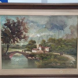 QUADRO OLIO SU TAVOLA 68X48 M.L. MIGLIORATI PAESAGGIO CON PONTE E CASE CORNICE LEGNO 90X70 VM