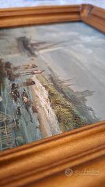 PREZZO TRATTABILE Vendo grazioso dipinto a olio su tavola raffigurante una veduta di porto con imbarcazioni a vela. L'opera si distingue per la vivacità dei colori e la tecnica materica delle pennellate. Dimensioni tavola: 20 x 25 cm. Dimensioni totali: [Aggiungi misura con cornice]. Cornice: Inclusa, in legno dorato con decorazioni angolari, in perfetto stato. Note: Già predisposto con gancio sul retro per l'affissione. Ideale per amanti del genere marino o come raffinato complemento d'arredo.