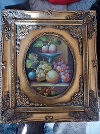 Vendo elegante quadro dipinto a mano a olio su tavola, soggetto natura morta con frutta (uva, pesche e ciliegie).