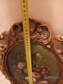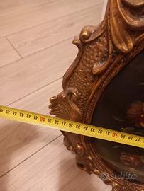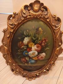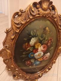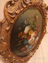 raffinato quadro olio su tavola bombato dipinto a mano anni 70-80 con cornice ovale in legno dorato lavorato dimensioni 41x53x6cm