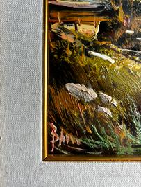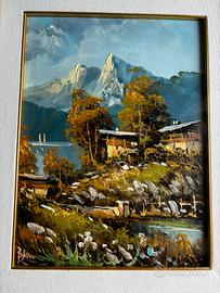 Vendo quadro olio su tavola raffigurante un tipico paesaggio alpino con chalet, lago e gregge in primo piano, montagne sullo sfondo.
