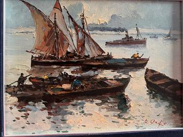 Quadro/dipinto Olio Su Tela Barche A Vela con pescatori nel golfo della laguna. Fattura pregevole.